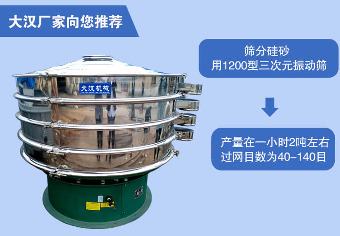 近期有客戶詢問我們銷售客服問篩分烘干后的硅砂產(chǎn)量在一小時(shí)2噸左右,過網(wǎng)目數(shù)為40-70目、70-140目適合用什么型號(hào)的振動(dòng)篩,小編根據(jù)客戶所篩分的物料與過網(wǎng)數(shù)目和產(chǎn)量推薦使用1200型三次元振動(dòng)篩