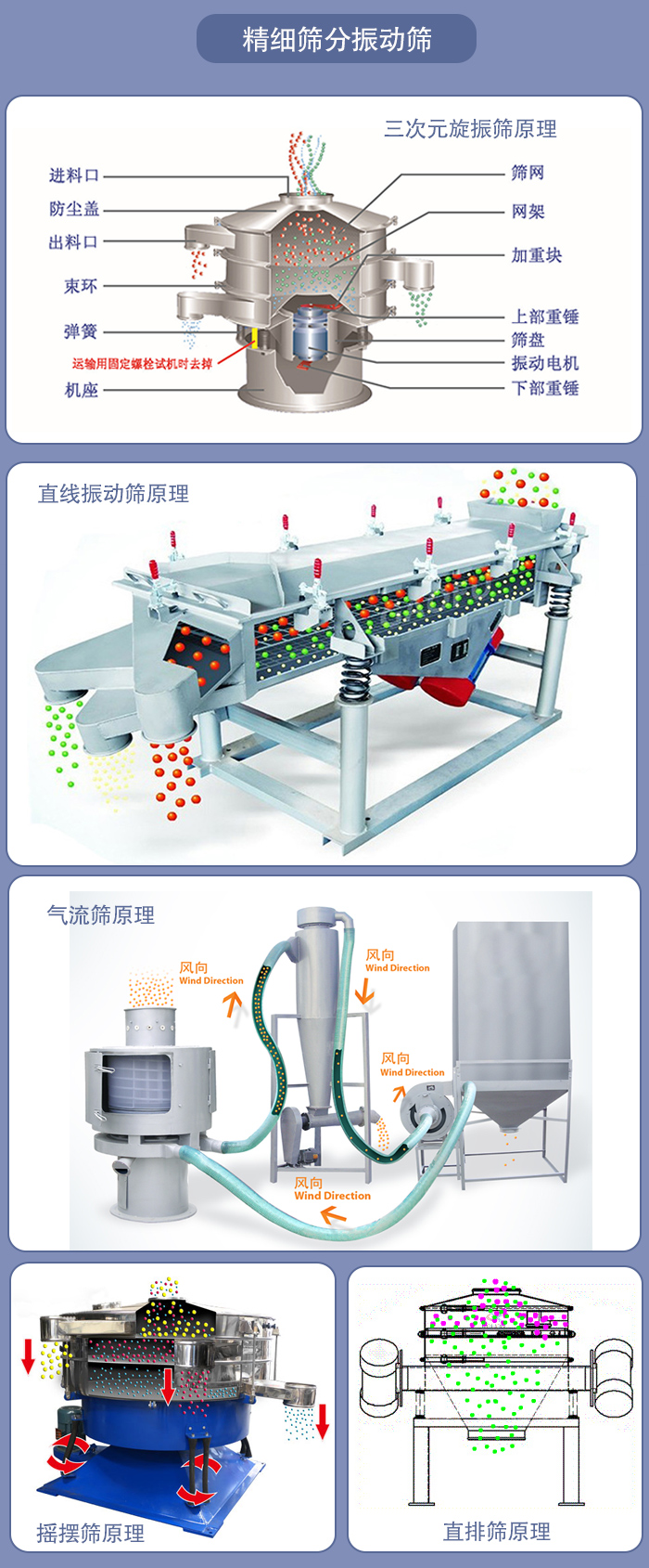 振動(dòng)電機(jī)的高速轉(zhuǎn)動(dòng),使篩體周期性高頻振動(dòng),有效地消除由于內(nèi)摩擦、潮解、帶電、成分偏析等原因而引起的架橋、搭拱、堵塞等現(xiàn)象,大大提高工作時(shí)的速度,最終實(shí)現(xiàn)篩選、除雜、過(guò)濾、分級(jí)的目的。