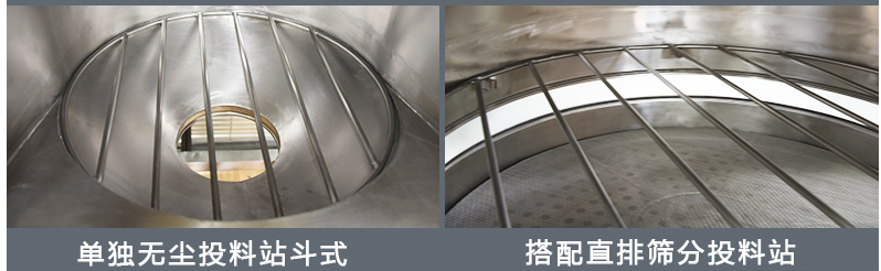 設(shè)置格柵,有效防止PE袋與粉末接觸,并配有振動(dòng)篩(一般是直排篩或旋振篩),可有效攔截異物,確保出料合格。